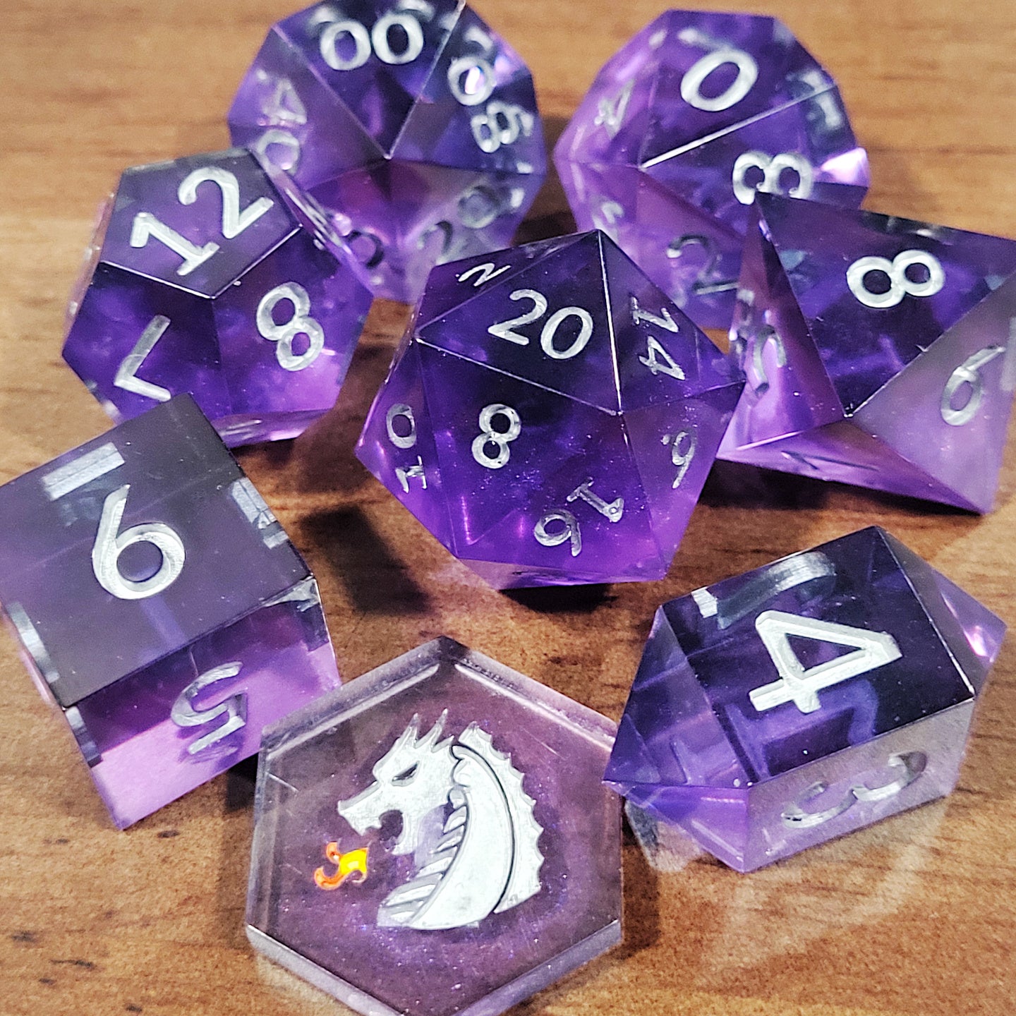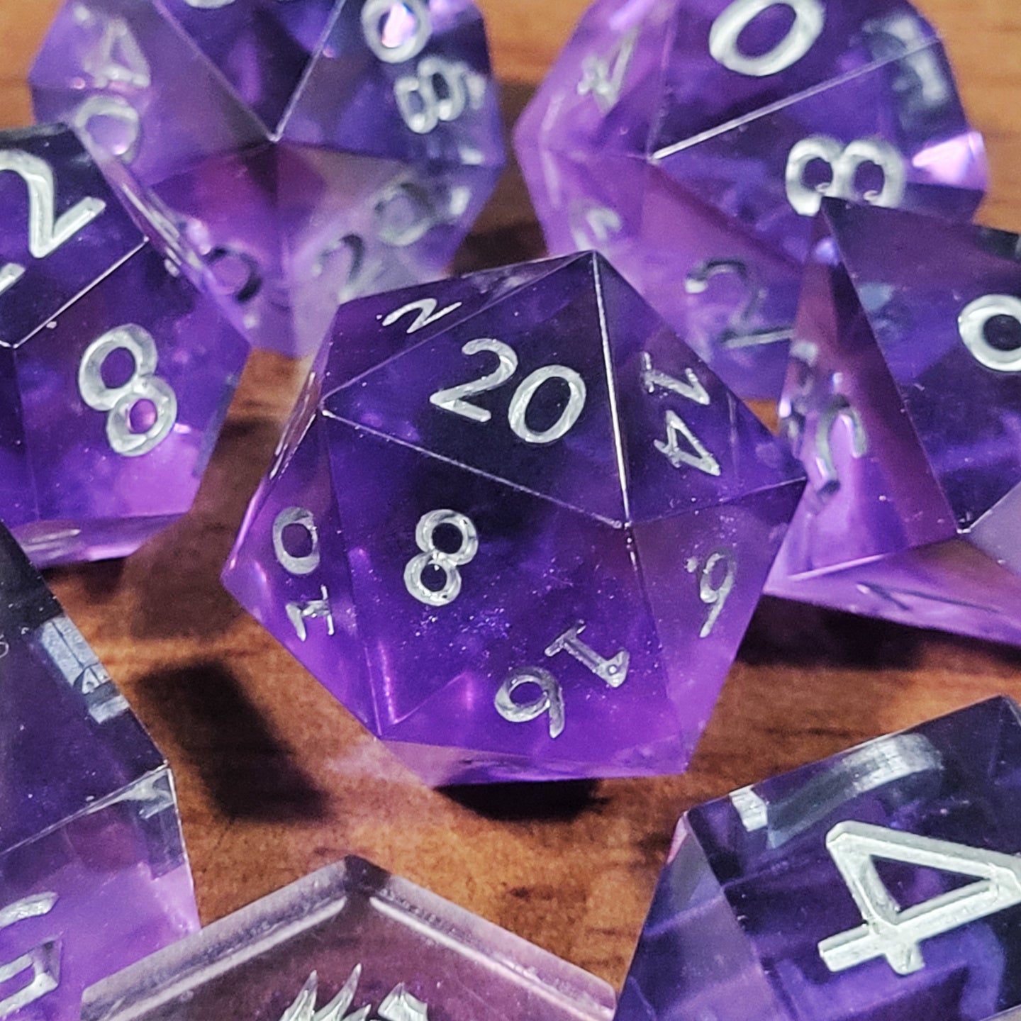 Handmade resin seven piece dice set in purple and black resin. Numbers inked in silver.