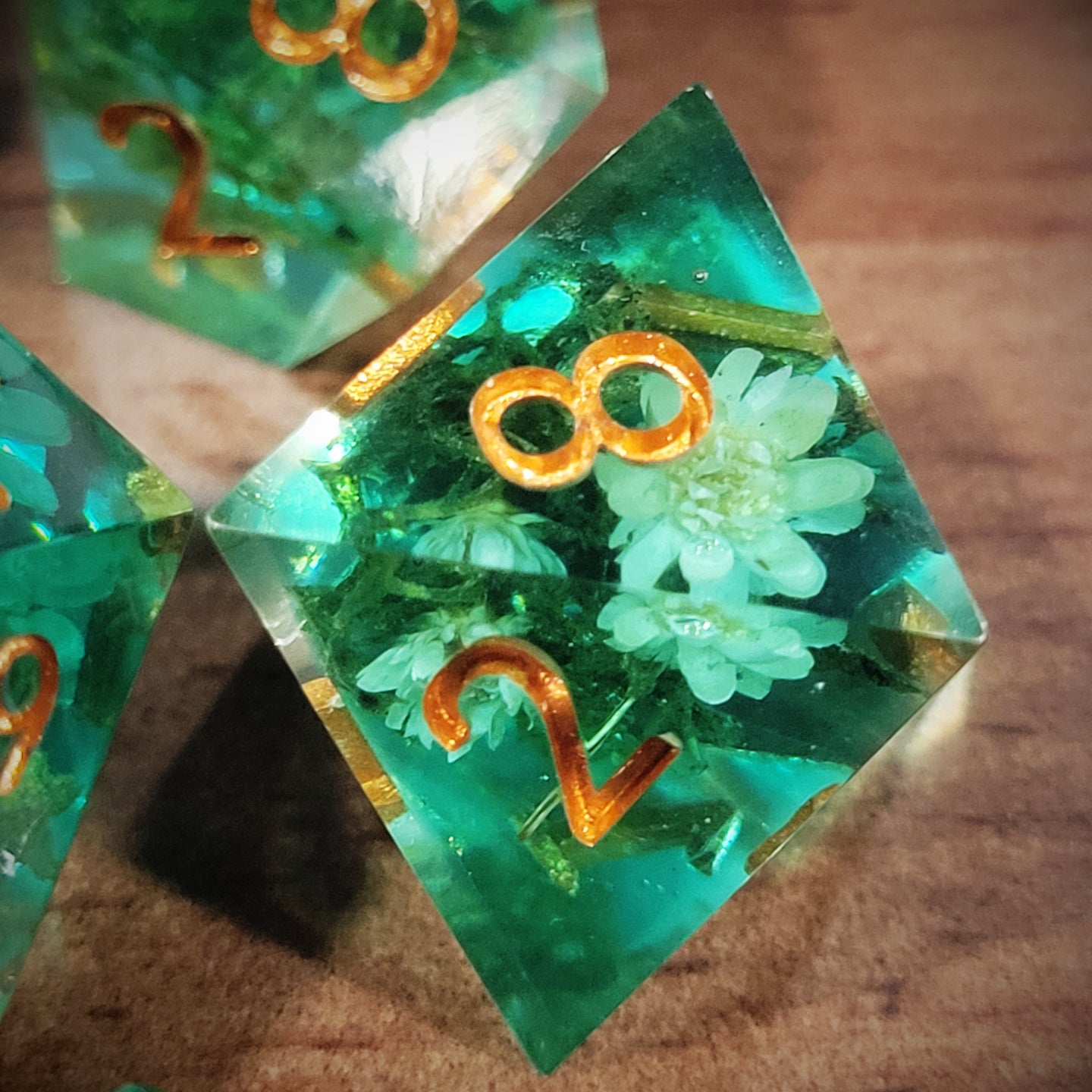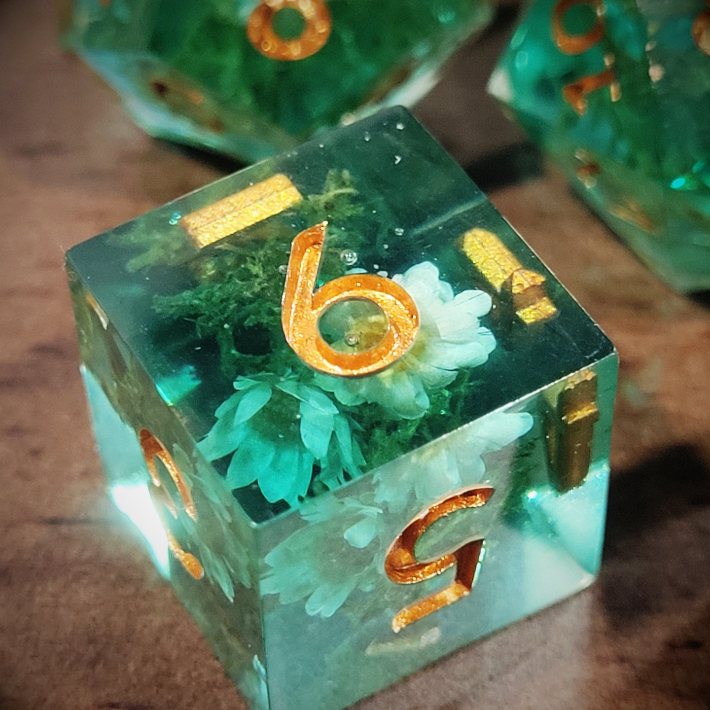 Handmade resin seven piece dice set with small white flowers and moss in blue green resin. Numbers inked in gold.