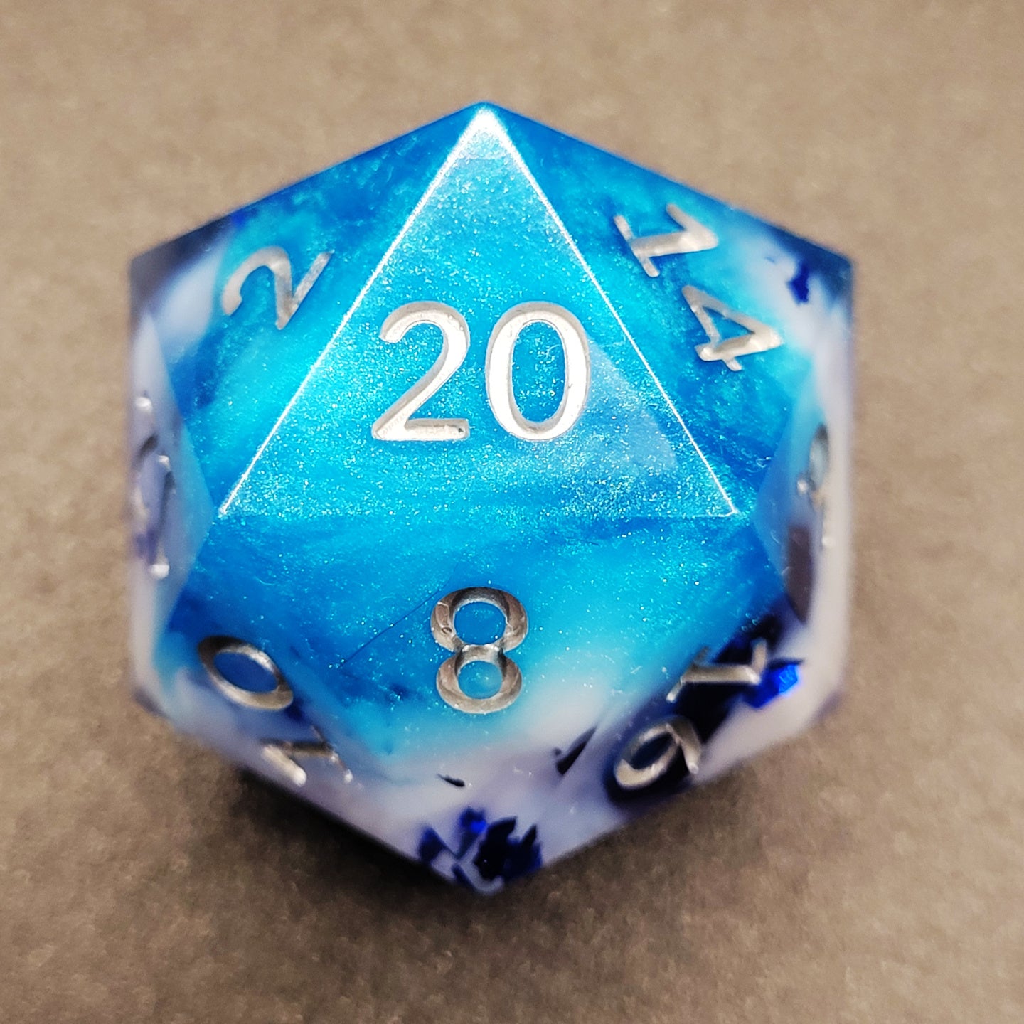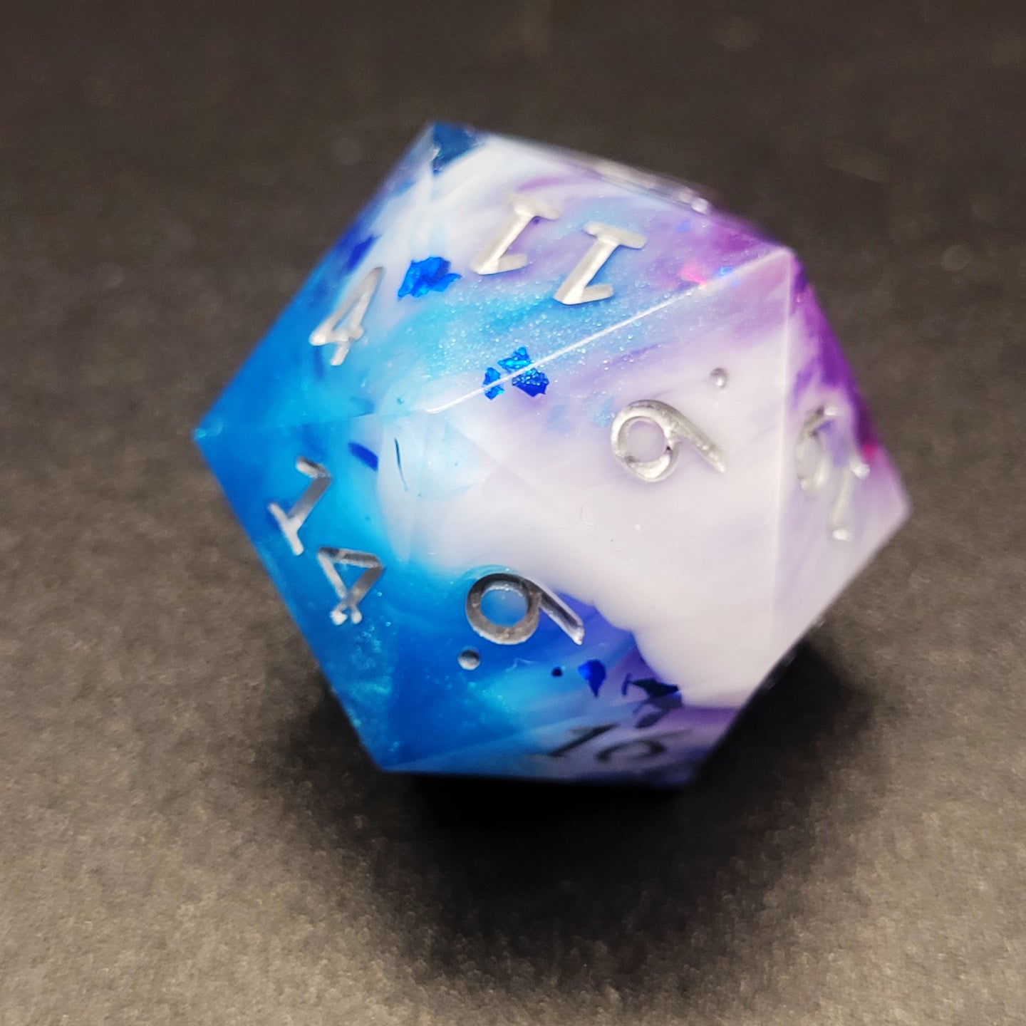 Handmade resin 35mm chonk D20 single die in blue, purple and white marbled resin with glitter flake. Numbers inked in silver.
