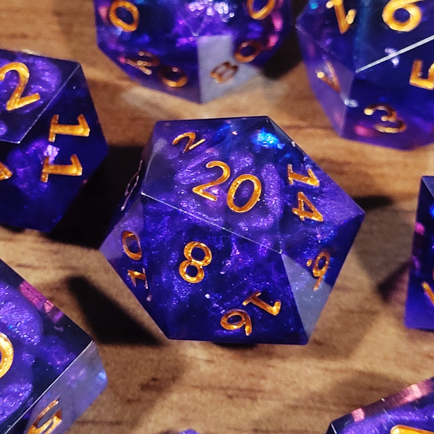 Handmade resin seven piece dice set in magical blue and purple with mylar flake. Numbers inked in gold.
