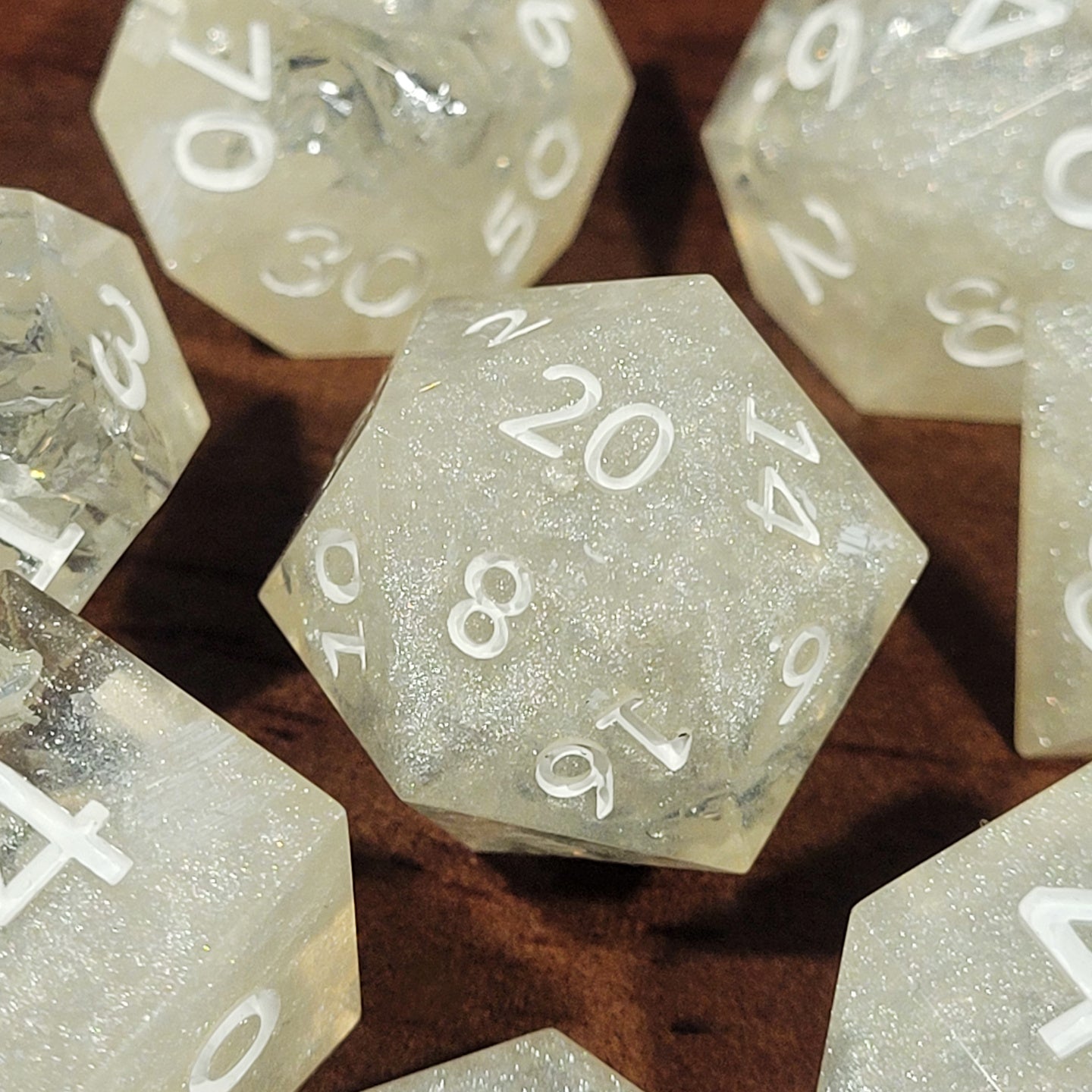 Handmade resin seven piece dice set in ice white with silver flakes. Numbers inked in white.