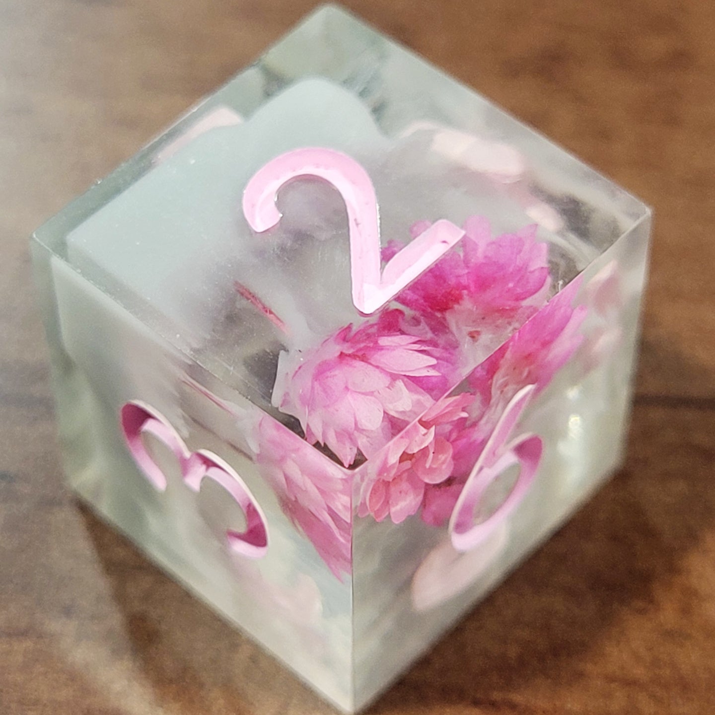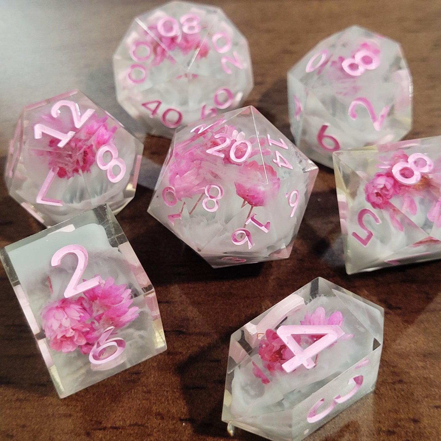 Handmade resin seven piece dice set with small pink flowers and gray resin. Numbers inked in pink.