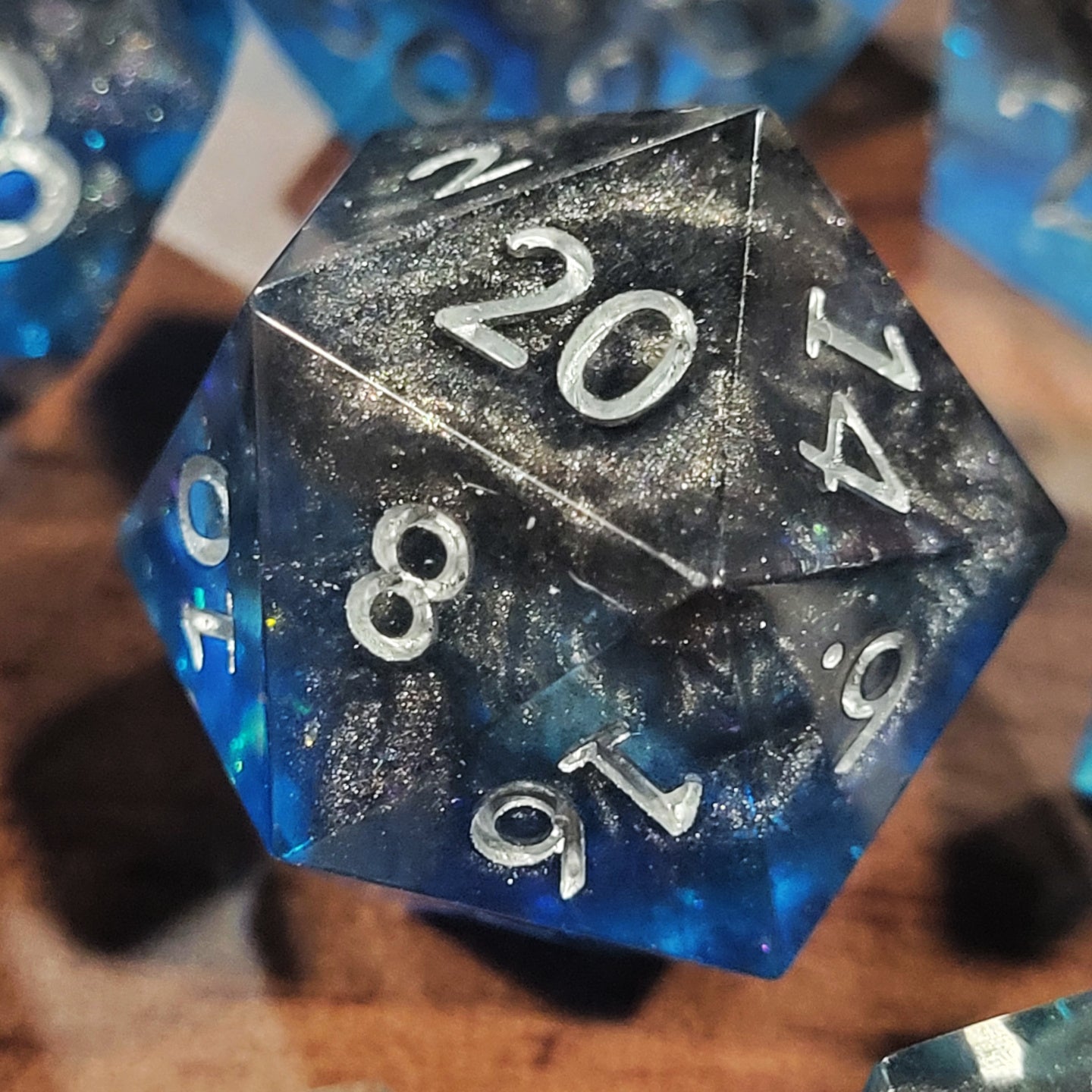 Handmade resin seven piece dice set in spacy grey mica and blue resin with mylar flakes. Numbers inked in silver.