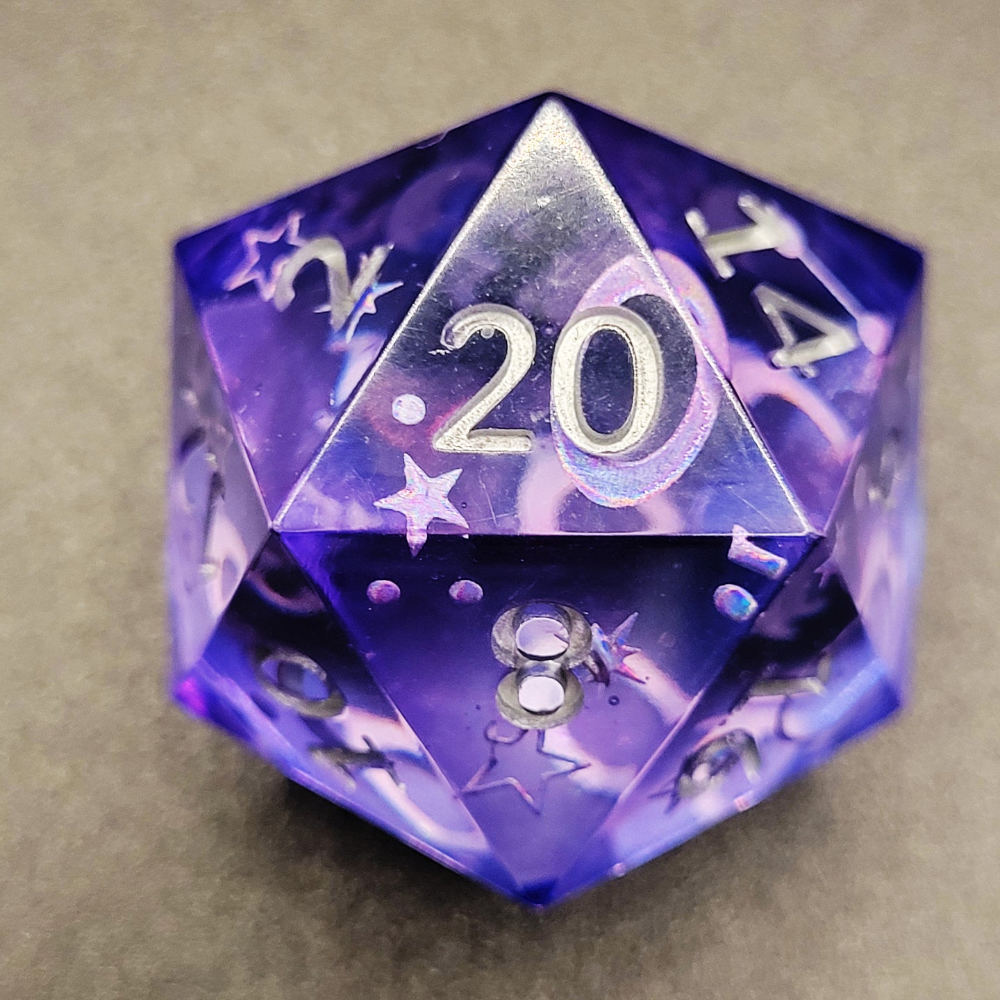Handmade resin 35mm chonk D20 single die in clear purple with star foil stickers. Numbers inked in silver.