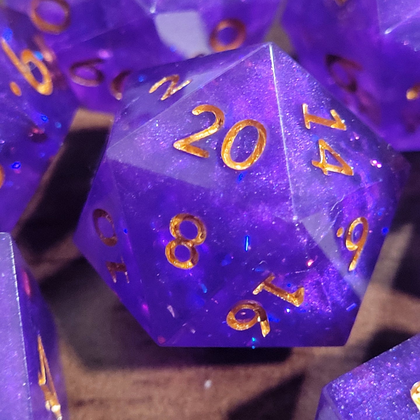 Handmade resin seven piece dice set in purple with mylar flakes. Numbers inked in gold.
