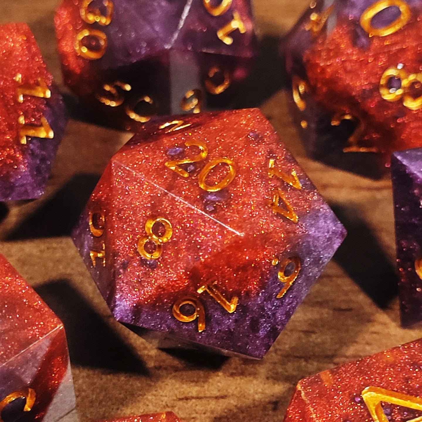 Handmade resin seven piece dice set in red and purple. Numbers inked in gold.