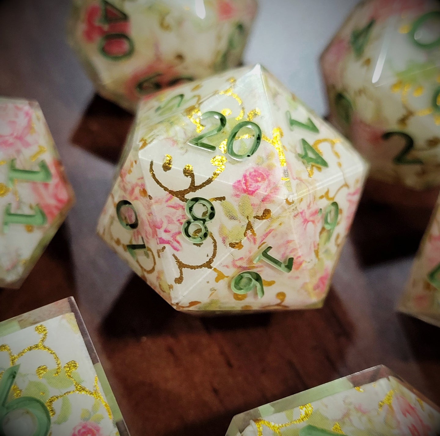 Handmade resin seven piece dice set with roses and gold washi tape. Numbers inked in matcha green.